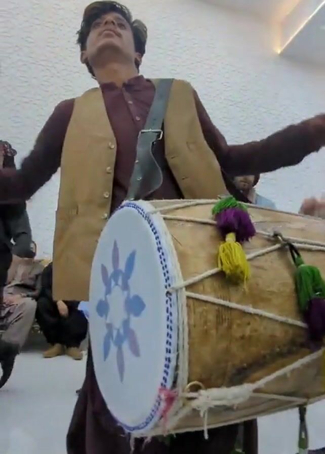 - "young man playing a dhol, a double-sided barrel drum, at an indoor gathering" by FM-Y0qmk2, licensed under CC BY 4.0