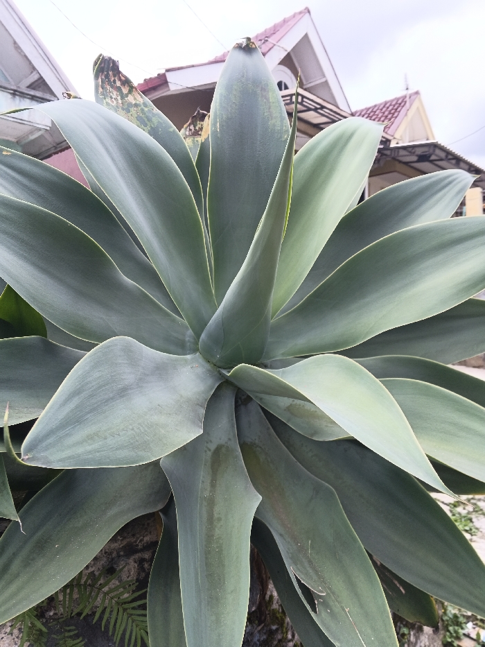 A large agave plant dominates the frame, its thick, bluish-green leaves spiraling upwards. Some leaves show signs of browning at the tips. Behind the plant, portions of a house are visible, featuring a red-tiled roof and white siding. The sky is overcast and muted. Ferns and moss appear at the base of the agave, suggesting a humid environment.
