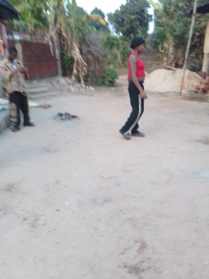 The image depicts an outdoor scene in the city of Unknown, Unknown, characterized by unpaved ground and natural vegetation. In the midground, a person with dark skin, wearing a red tank top and black track pants with white side stripes, walks from left to right, their head turned to the right. To their left, another person with dark skin stands on a concrete step or ledge, wearing a light-colored, long-sleeved garment and dark pants; white earbuds are visible around their neck, and they appear to be focused on an object in their hands. Between these two individuals, on the dirt ground, are several dark, irregular objects, possibly ash or debris. The background features dense green foliage, dried brush, and a reddish-brown wall or gate on the left. On the right, a pile of light-colored material, likely sand, is visible next to a thin pole, with a blurry figure seated in the far background.