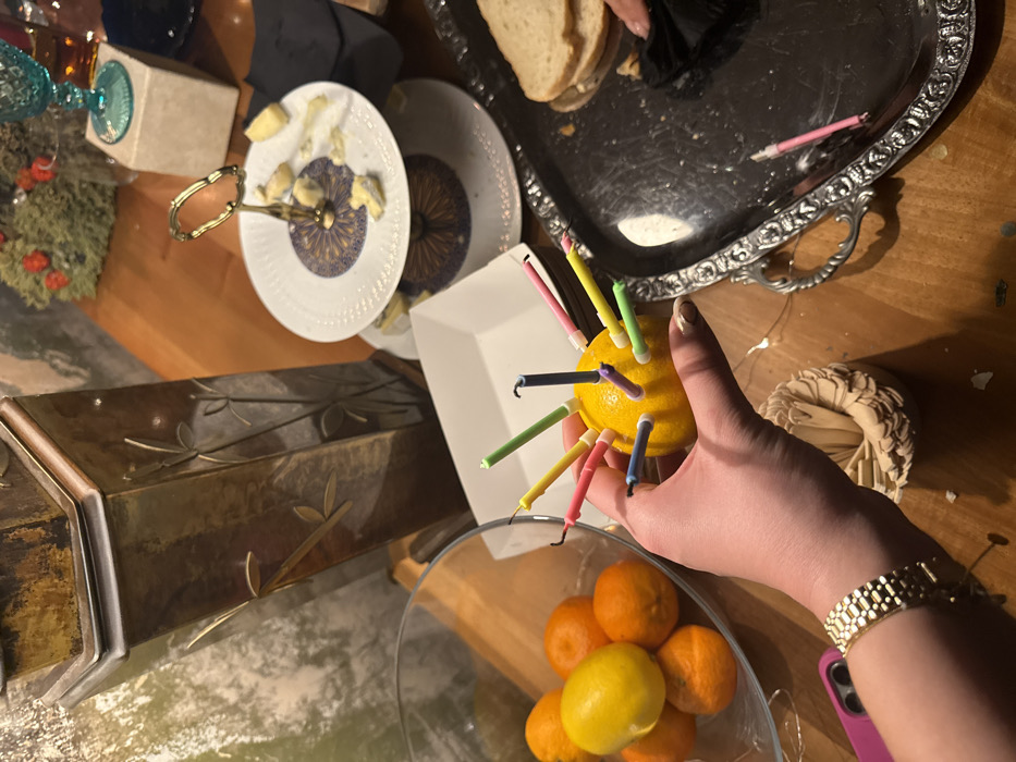 A hand holds a lemon punctured with colorful birthday candles. Below the lemon, a glass bowl contains citrus fruits. In the background, an ornate metal tray displays bread, and plates hold cheese and other items. A gold box with leaves sits nearby, and a small wreath is visible on the right. A gold watch adorns the wrist of the hand holding the lemon.