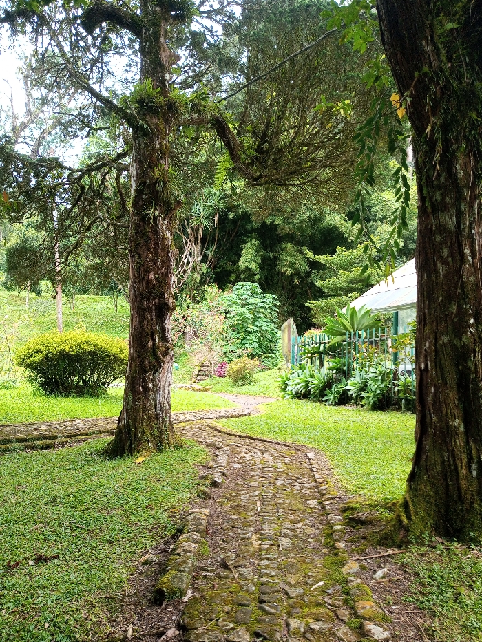 A mossy stone path winds between two tall trees towards a verdant garden