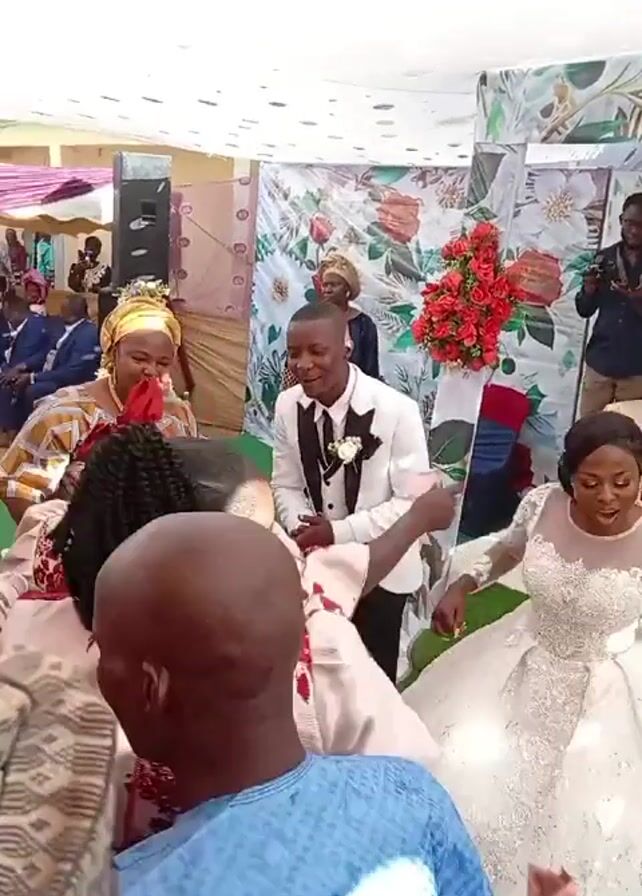 The video captures a joyous wedding celebration with a newlywed couple at the center of attention. The groom, clad in a white tuxedo jacket and black pants, stands beside the bride, who is resplendent in a full, lace-detailed white wedding gown. Both are smiling brightly, clearly enjoying the moment. Attendees gather around, some extending their hands towards the couple, presumably offering congratulations or blessings. The bride and groom both dance a bit for the camera. The scene unfolds under a canopy decorated with floral arrangements and colorful fabrics, indicating an outdoor or tented reception area. In the background, guests are seated, and a cameraman is filming the event. The wedding decorations are simple yet elegant, adding to the festive atmosphere. The people are dressed in their best, some in traditional outfits and others in modern attire.
