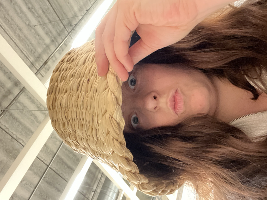 This is a close-up, low-angle photographic portrait of an adult female, located within an indoor commercial establishment in Wiesbaden, Germany. The subject wears a large, light-brown woven straw hat with a visible braided brim that partially obscures her face. Her left hand is positioned on the hat's brim, lifting it slightly to reveal her wide-open, light-colored eyes. Her lips are pursed in a distinct facial expression. Below her chin, a light-colored, zippered garment is visible. The background features a grey, industrial-style ceiling with overhead white beams and visible utility infrastructure.