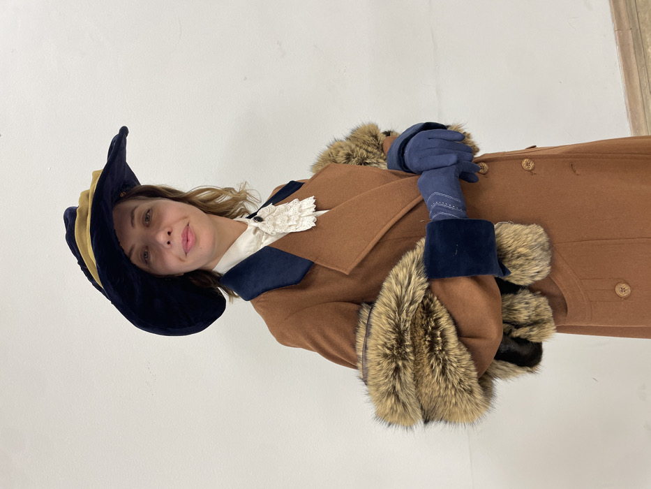 A woman is depicted standing in Bijela, Montenegro, positioned against a plain white wall. She is shown from approximately the waist up, facing forward with a slight smile. She wears a large, dark blue velvet hat with a wide tan band. Her attire includes a rust-brown long coat, appearing to be wool, with dark blue velvet lapels and matching velvet cuffs. Beneath the coat, a white high-necked shirt with a ruffled, lace jabot and a dark button is visible. A multi-toned brown and tan fur stole is draped over her left arm and shoulder. Both hands wear dark blue gloves with light-colored stitching details. A narrow strip of light-colored flooring with a darker baseboard is visible at the bottom right of the frame.