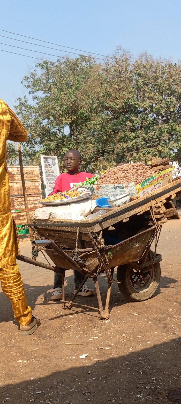 - "An outdoor scene in Kachia, Nigeria, depicts a young male vendor standing behind a heavily loaded, rustic wooden cart, likely a modified wheelbarrow, positioned on an unpaved, dirt ground" by FM-NuR9d2, licensed under CC BY 4.0