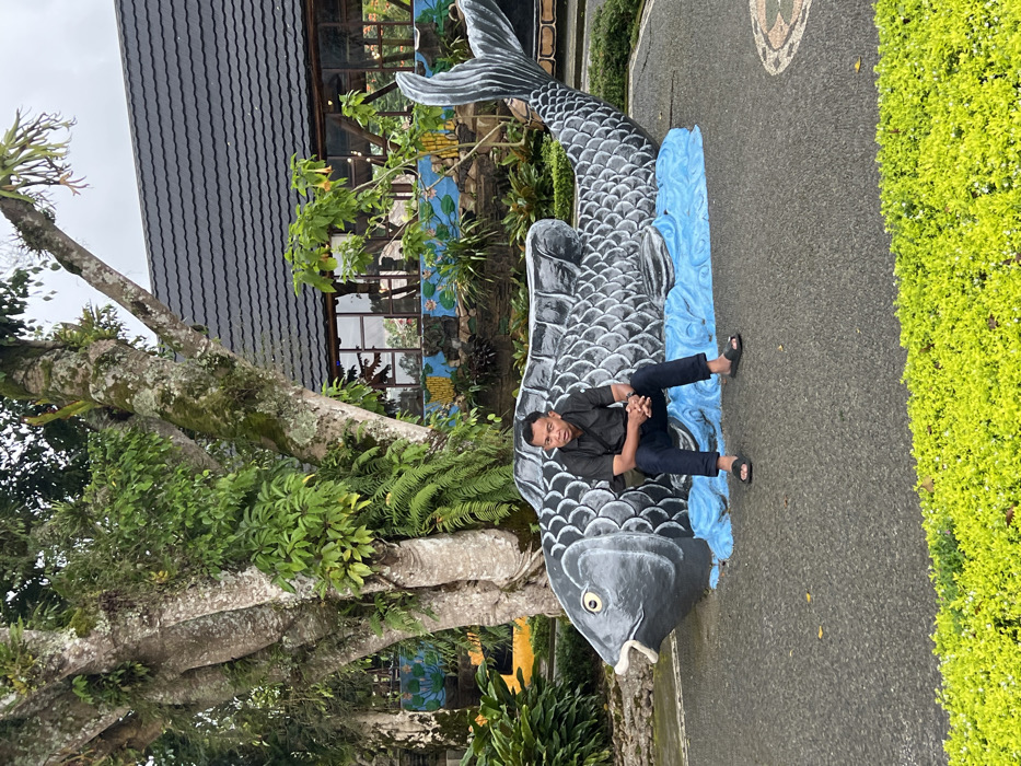 A man sits on a large, sculpted fish lying on its side. The fish is grey with white scale markings and blue "water" detail. The man wears a dark shirt and pants, and sandals. To the left is a large, gnarled tree with foliage. A building with a dark roof is visible in the background, along with other plants. A paved area and a neatly trimmed hedge are on the right.