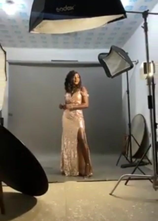 In a brightly lit photography studio, a woman stands in front of a grey backdrop wearing a sparkling gold, floor-length dress with a high slit on the left leg