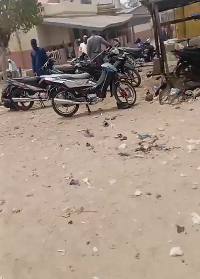 n outdoor scene, seemingly a street or roadside area. The ground is mostly dirt with scattered trash, and several motorcycles are parked. Some people in white robes and orange bottoms walk along the street, while others mill around the motorcycles. A man crouches near one of the bikes, possibly doing maintenance. The environment appears somewhat urban, with buildings visible in the background, but also unkempt and possibly impoverished due to the visible trash.