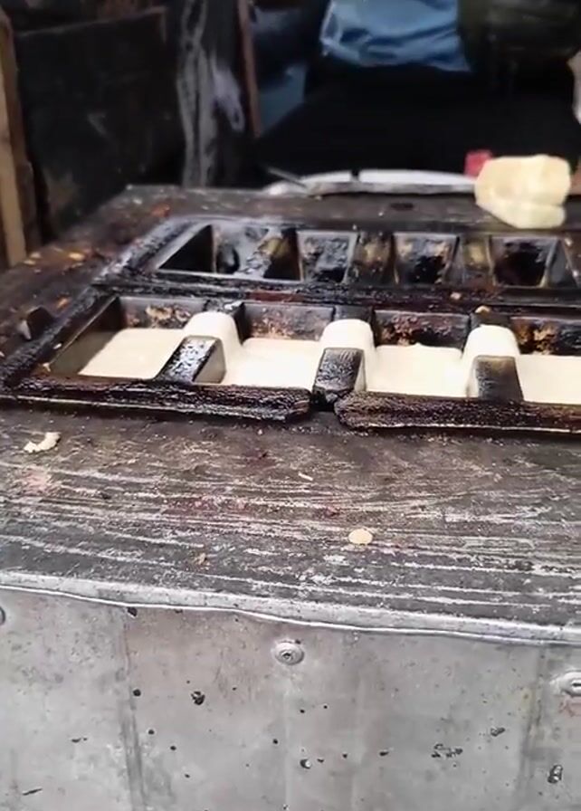 In a close-up shot, a person is seen pouring a white, viscous batter from a white container into a dark, rectangular mold with several sections. The mold sits on top of a metal container with visible rivets and discoloration. The person pouring the batter is wearing a blue shirt, and a portion of another person's arm is visible in the background. The setting appears to be outdoors.