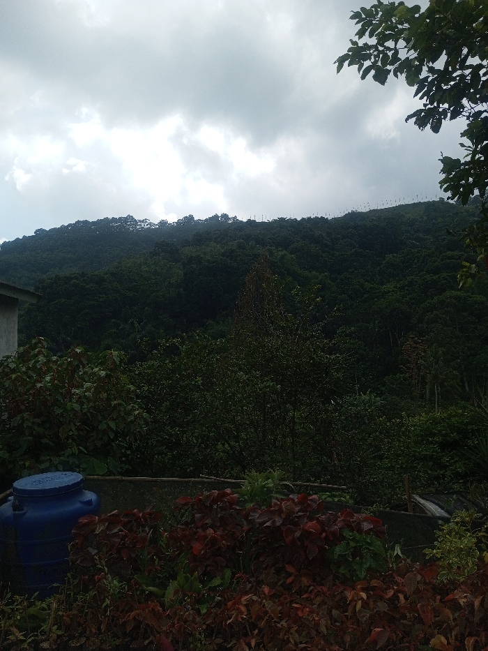 This image, captured in Cibodas, Indonesia, presents a detailed view of a lush, forested mountain landscape under an overcast sky. In the foreground, positioned on the left, is a large, blue plastic barrel with a dark lid. Immediately in front of and surrounding the barrel, extending across the lower portion of the frame, is dense vegetation comprising various plants; many display reddish-brown foliage, while others are green. A low, dark, horizontal structure, possibly a fence or wall, runs behind these foreground plants. The midground is dominated by a thick canopy of dark green trees and shrubs, forming a dense forest that slopes upwards. A segment of a light-colored building's corner and roofline is visible on the far left, partially obscured by the foliage. In the upper right corner, a dark tree branch with green leaves slightly overlaps the sky. The background features a prominent, forested mountain or hill, completely covered in dark green trees. Along the ridgeline of this hill, a series of thin, dark, vertical poles or markers are evenly spaced. The sky above is cloudy, characterized by grey and white cloud formations. No individuals or apparent interactions are present in the scene.