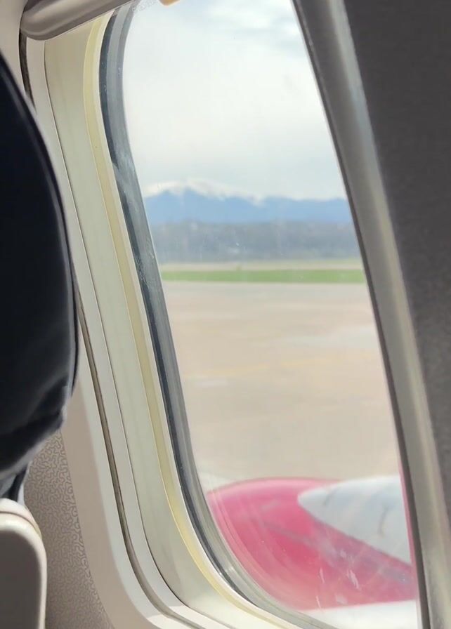 view from an airplane window. The wing of the plane, painted with red and white stripes, is partially visible below the window. Outside, a runway stretches into the distance. Beyond the runway, there's a green patch of land, followed by a town or a settlement. In the far background, snow-capped mountains can be seen under a cloudy sky. The interior of the plane is visible, including the window frame and a portion of a seat with a black headrest.