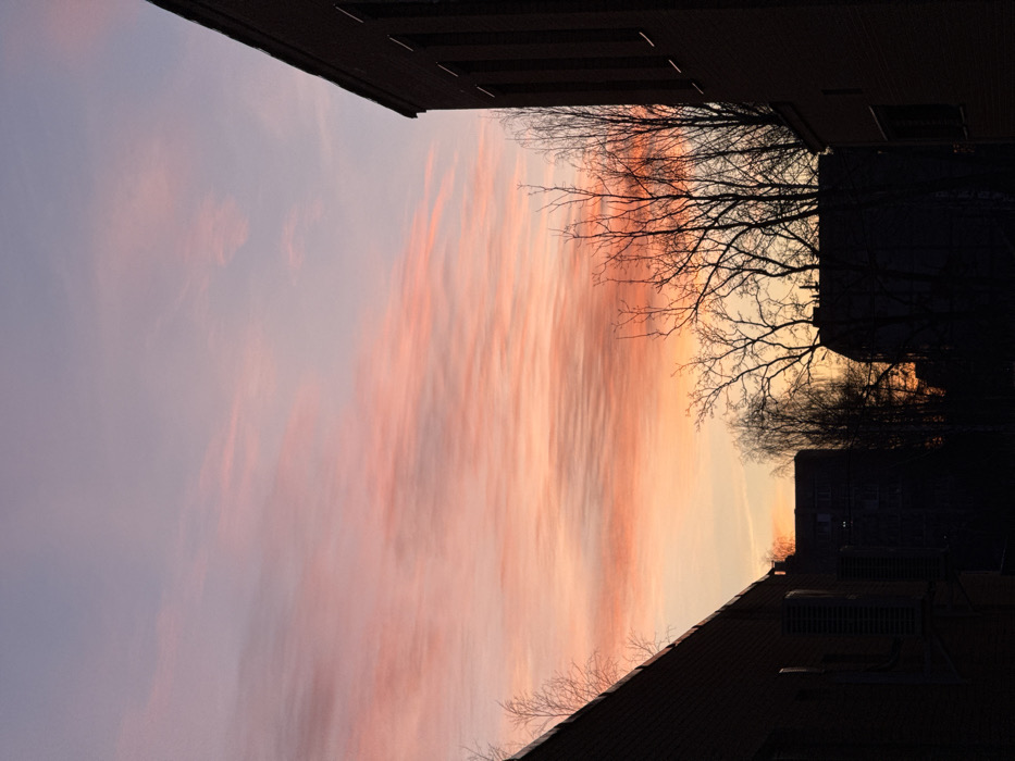 The image displays an urban landscape in Bol'shie Mkhi, Russia, at either sunrise or sunset, characterized by dramatic backlighting. The sky dominates the upper two-thirds of the frame, transitioning from a light purple hue at the top to vibrant pink and orange tones near the horizon. Wispy, horizontally aligned clouds are visible across the colored sky. Two brick buildings frame the scene, appearing as dark silhouettes in the foreground. A multi-story brick building occupies the left side, with several dark rectangular air conditioning units mounted on its exterior wall. Its roofline is visible, from behind which small, bare tree branches protrude. A similar multi-story brick building forms the right border, displaying dark, recessed window openings along its visible side. In the mid-ground, between these two prominent structures, a dense cluster of bare deciduous trees with intricate branch networks stands silhouetted against the bright sky. Further back, additional multi-story buildings are visible as dark, indistinct forms. No individuals, animals, or active interactions are present within the frame. The overall impression is one of a quiet, early morning or late evening urban scene.
