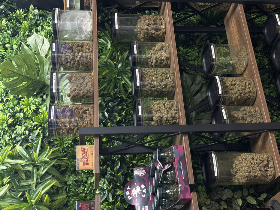 This image depicts an indoor retail display in Puteaux, France, featuring multiple shelves against a vibrant green artificial foliage wall. The shelving unit consists of dark-colored metal supports and three visible wooden shelves. No individuals are present, and no actions or interactions are occurring. The shelves display various products, primarily clear plastic jars with black lids containing dried plant material. **Top Shelf (from left to right):** * A partially visible red and black package. * A brown "RAW Classic King Size Slim" rolling paper package. * Four clear plastic jars, each containing distinct types of plant material. The first jar is labeled "PLUTONIUM," the second "RASPBERRY MUFFIN," and the third "FOG," all filled with brownish-green bud-like structures. The fourth jar, labeled "SNOWBALL H-D8," contains light-colored, possibly fibrous material enclosed in a transparent bag. A fifth jar, partially visible, is labeled "WOODS." **Middle Shelf (from left to right):** * A camouflage-patterned cardboard display box for "PRT LAB OFFICIAL" featuring small glass jars, some of which contain green plant material. The box shows a "15% OFF" sticker. * Four clear plastic jars, each filled with green to brownish-green plant material. Labels identify them as "ZUSHI," "MANDARINE KUSH," "RUNTZ," and "ORACLE H%N." **Bottom Shelf (from left to right):** * A tall clear plastic jar labeled "ROCK N BERRY CRU," filled with brownish-green plant material. * Two shorter clear plastic jars, labeled "TRUMP" and "SUPER LEMON HAZE H%N," both containing green plant material. * A final clear plastic jar labeled "PASTAZZO," containing finely ground green plant material.