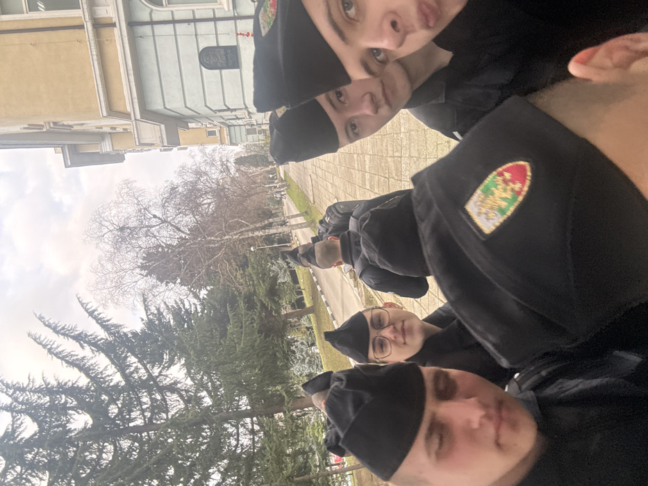 A group of approximately six to eight young individuals in black uniforms and black garrison caps are depicted outdoors on what appears to be an overcast day. The scene is located at the Medical University of Varna "Prof. Dr. Paraskev Stoyanov" in Varna, Bulgaria, specifically identifiable by the distinctive architectural style of the building on the right, which features light yellow upper floors and a light blue lower section with white trim and a dark rectangular plaque. In the foreground, the image is a selfie taken by one of the individuals, whose black garrison cap with a multi-colored crest (featuring green, red, and yellow elements) partially obscures the bottom right. To the left, a male individual with a strong jawline and eyes closed or downcast is visible. Next to him, a female individual wearing glasses looks directly at the camera with a faint smile. Further back, several individuals in identical uniforms are walking away from the camera, their backs visible, with some carrying black backpacks. One male individual on the far right, in the mid-ground, is also looking towards the camera with a puckered expression. The environment includes a paved pedestrian walkway in the mid-ground. To the left of the walkway, a landscaped area contains tall coniferous trees with dark green foliage. To the right, the aforementioned building facade runs parallel to the walkway. In the background, beyond the walkway, a line of deciduous trees with bare branches suggests the season is late autumn, winter, or early spring. The sky is uniformly light gray and overcast.