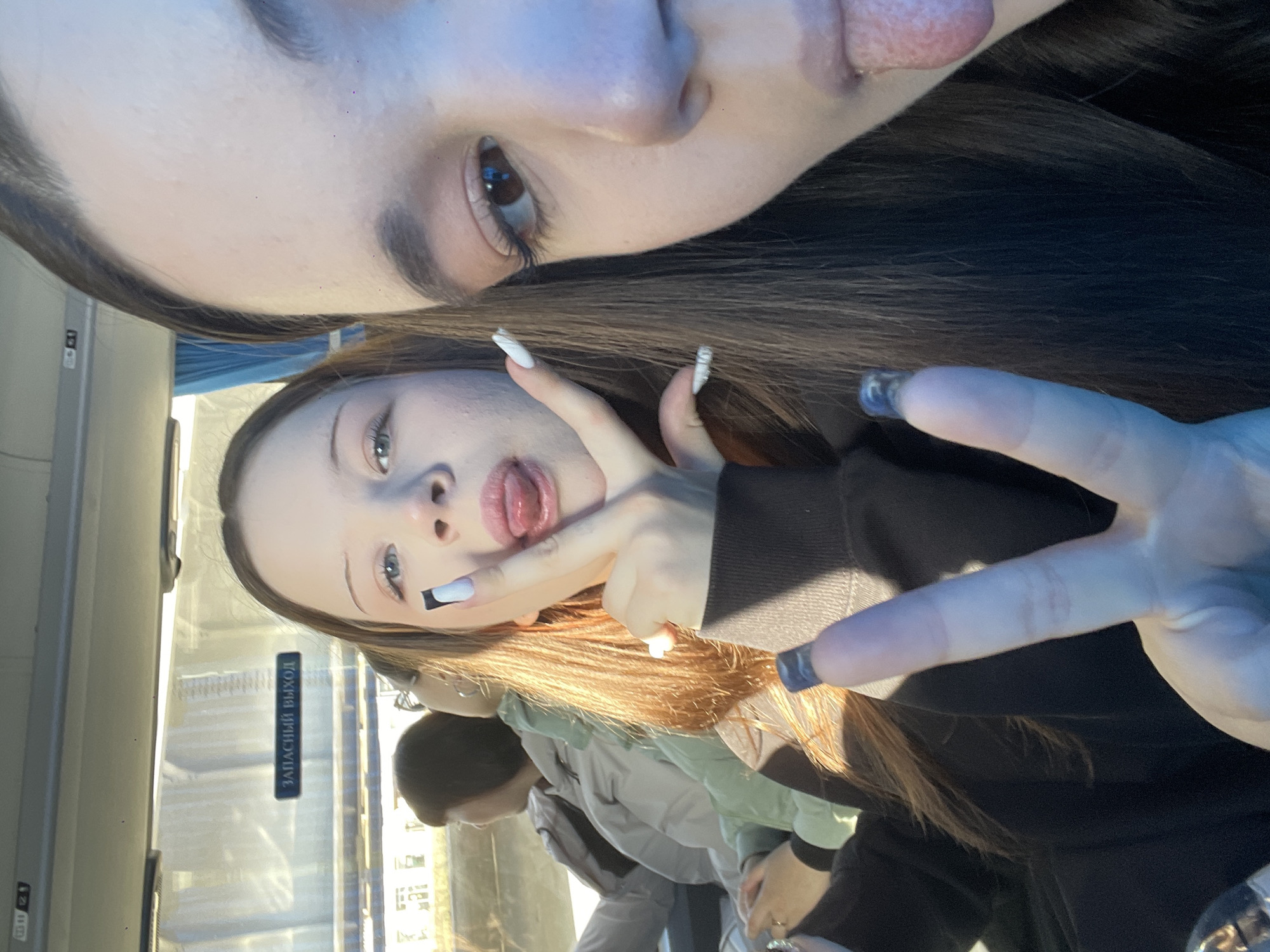 Two young women pose for a selfie inside a bus or a train. The one in the foreground has long brown hair with reddish highlights, and she is wearing a black hoodie. She is making a peace sign with her hand and sticking her tongue out slightly. Her nails are painted white, except for one that is blue. The other woman, who is partially visible in the background, is also sticking her tongue out. They appear to be traveling on public transportation, as indicated by the window and the presence of other passengers in the background. The text on the window is in Russian, "ЗАПАСНЫЙ ВЫХОД", which translates to "EMERGENCY EXIT". The image provides no explicit evidence of the location being in Moscow, Russia. The location could be inferred based on the Russian text on the window.