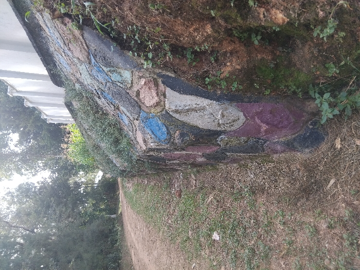 A stone wall features a colorful mosaic design with blues, purples, pinks, and grays. The wall is adjacent to a narrow dirt path, lined with sparse grass and weeds. Foliage and undergrowth cover the area above the wall. The angle suggests a pathway through a natural or park-like setting.