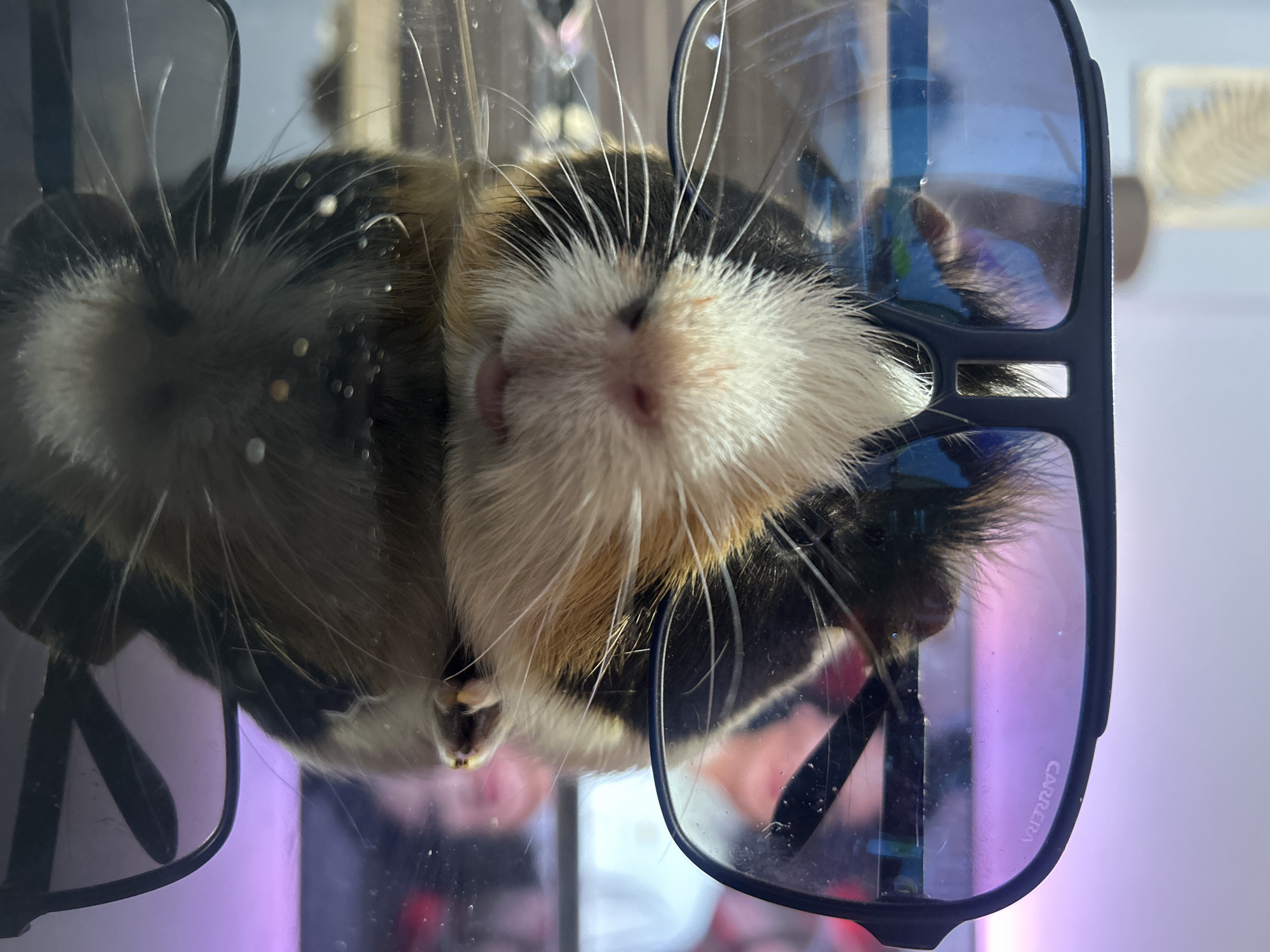 A close-up shot features a guinea pig with brown, black, and white fur wearing a pair of Carrera sunglasses