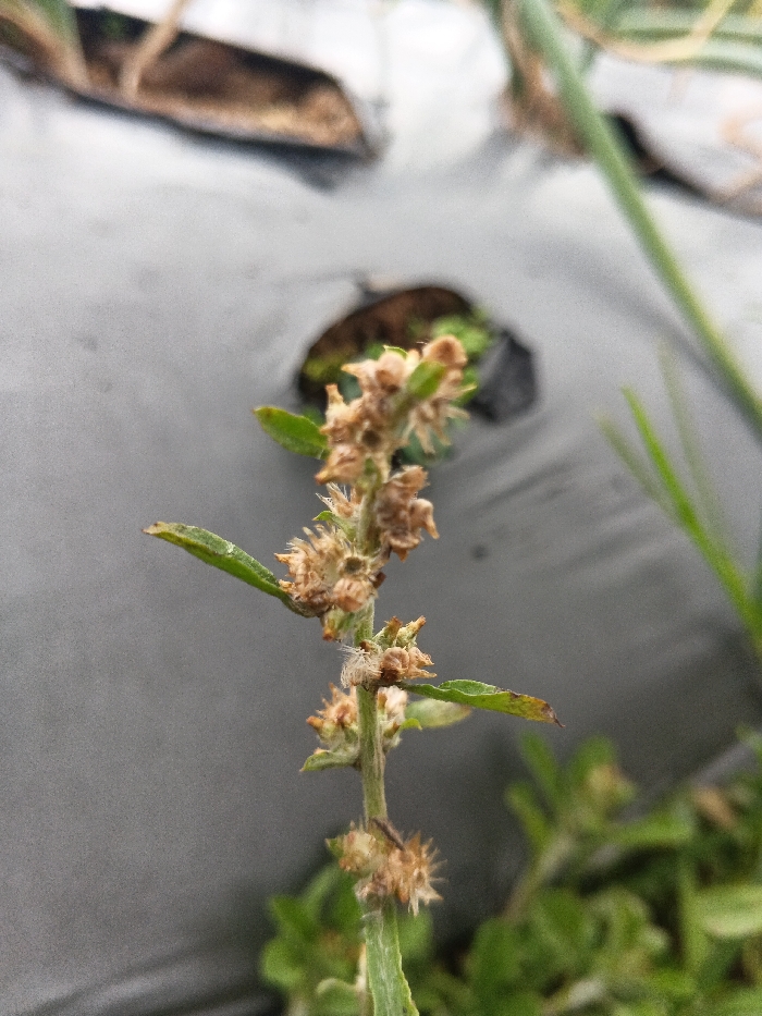 A close-up photograph taken in Pinnwe, Myanmar, depicts a single slender plant stem growing vertically in the foreground. The plant features numerous small, green, oval-shaped leaves and clusters of dried, light brown, spiky seed heads or withered flowers along its stem. The background is dominated by a grey, textured ground cover, likely agricultural plastic mulch, which runs horizontally across the upper and mid-sections of the image. A circular cutout in the grey ground cover, positioned slightly off-center to the left of the main plant, reveals dark brown soil and blurred green vegetation beneath. Additional blurry green plant matter is visible in the extreme foreground and diffused background, indicating a vegetated environment, possibly a cultivated field. No human figures or discernible actions are present.