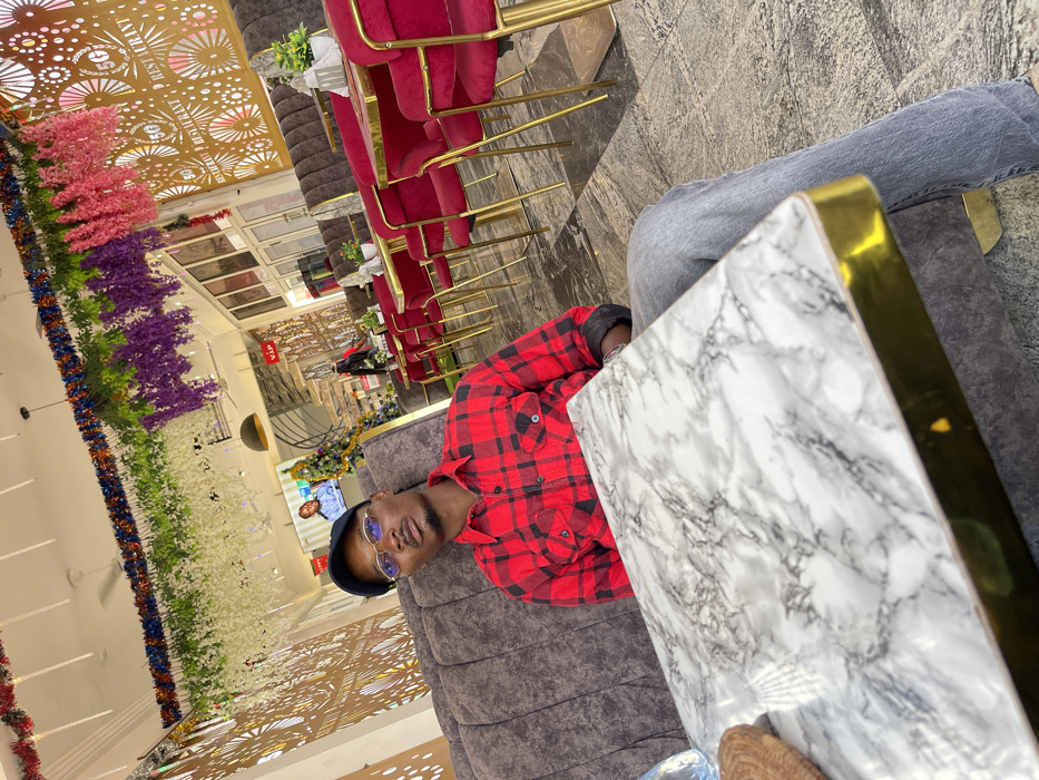 A man in a red plaid shirt and blue hat sits at a marble table in an ornate building
