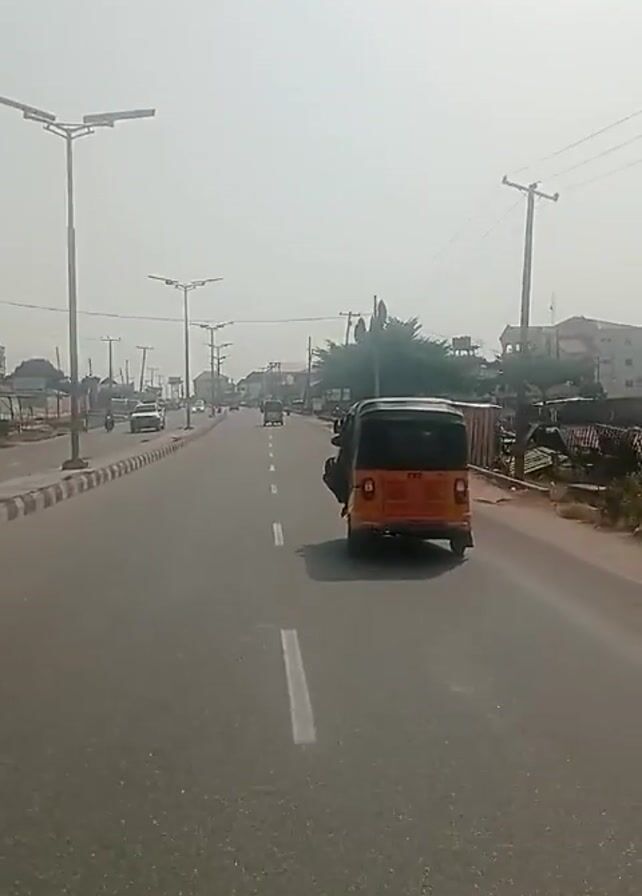 medium-wide shot of a paved road in an urban area. The road has two lanes in each direction, separated by a median. White lines mark the center of each lane. An orange auto rickshaw, also known as a tuk-tuk or keke, is traveling in the same direction as the camera. Other cars are seen further down the road in the distance. The sky is overcast and hazy. Streetlights line the side of the road. Some trees are on the side of the road and buildings are visible in the distance. The video is taken from a moving vehicle.