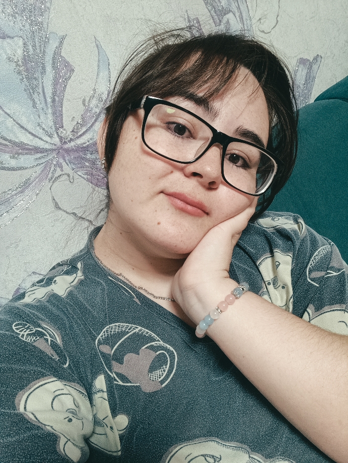 An individual is depicted in a close-up, chest-up shot within an indoor residential setting, purportedly in Noviy, Russia. The subject is a female with short, dark hair and dark-rimmed eyeglasses, presenting with a neutral expression and a slight smile while looking directly at the camera. Her left hand is raised, with fingers curled, supporting the left side of her jaw. She wears a dark blue t-shirt patterned with light-colored, cartoon-like illustrations of teacups and other undefined objects. A thin silver-colored chain necklace is visible around her neck, and a beaded bracelet, featuring light pink, light blue, and silver-toned beads, adorns her left wrist. The background features wallpaper with large, stylized floral patterns in shades of light purple and grey, exhibiting a textured or metallic finish. To the right of the subject, a section of teal or dark green upholstered furniture is partially visible.