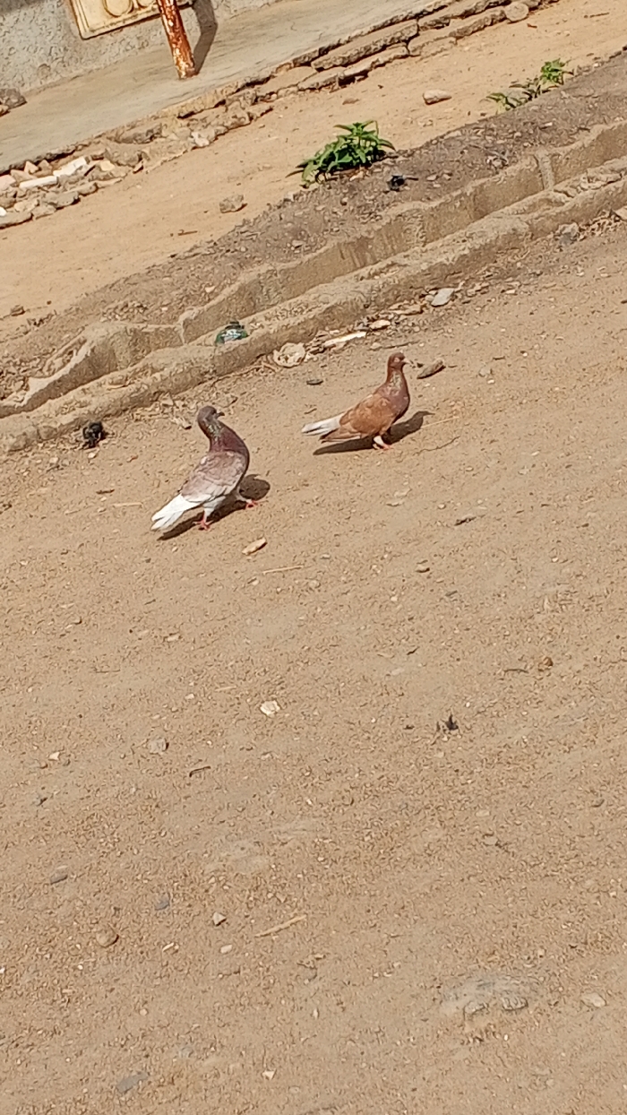 Two pigeons stand on a dirt ground in Sabon Tasha, Nigeria. The ground is uneven, with some small stones. The background includes a raised concrete structure with vegetation growing on it. The lighting is bright, suggesting a sunny day.