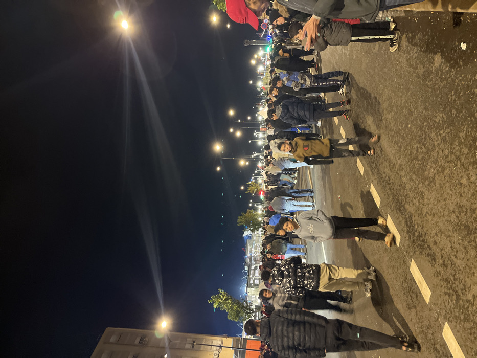 A nighttime shot displays a crowd gathered on a street. Streetlights illuminate the scene, casting long shadows of the numerous people present. The crowd appears to be a mix of age groups, mainly comprised of young adults and teenagers, standing close together on the road. A low building is partially visible in the foreground, and other buildings and structures are visible along the street further down where the people are gathered. The street appears to be a pedestrian zone at that time.
