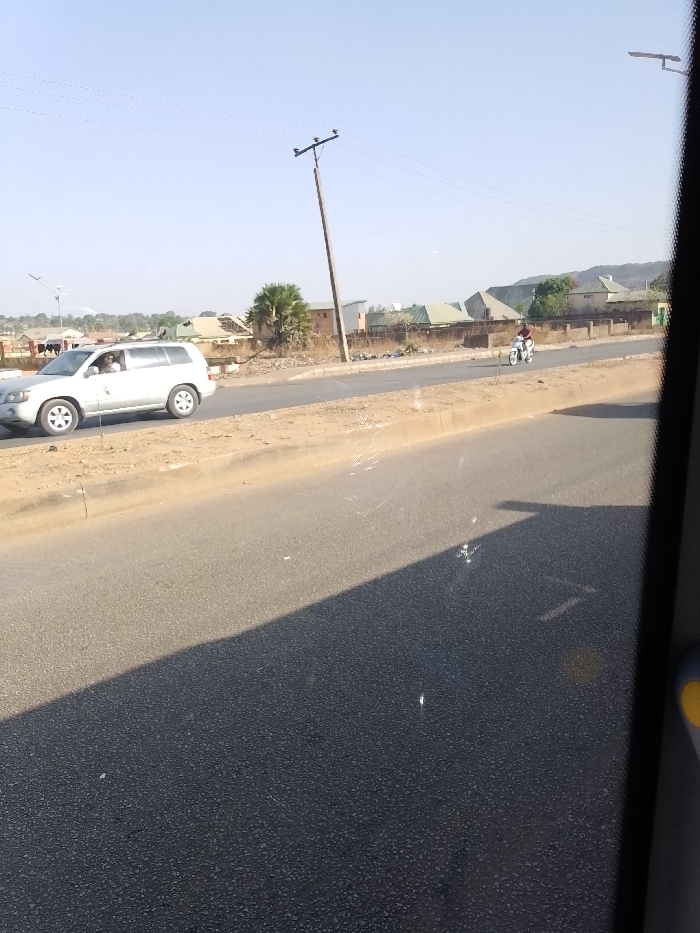The image depicts a daytime street scene in Bukuru, Nigeria, captured from inside a vehicle. A paved two-lane road runs horizontally across the mid-ground, with a raised dirt median separating it from the background. A silver SUV, possibly a Toyota Highlander, travels on the left lane, its male driver visible through an open window. Further down the road, on the right lane, a single individual rides a white motorcycle, traveling in the same direction as the SUV. In the background, a tall wooden utility pole with crossarms and power lines stands beside the road. Adjacent to the pole, a distinct palm tree is visible. Beyond the road and dirt median, various residential and commercial buildings with different colored roofs (green, brown) line the street, indicating an urban or semi-urban environment. A modern street light fixture is visible on the far left, above the SUV. The sky is clear and blue, suggesting sunny weather. Long shadows from the capturing vehicle are cast onto the paved road in the foreground, indicating the sun's position. Scratches and reflections are visible on the window through which the photograph was taken, and part of the vehicle's interior (likely a window frame and a yellow button) is visible on the far right edge of the frame.