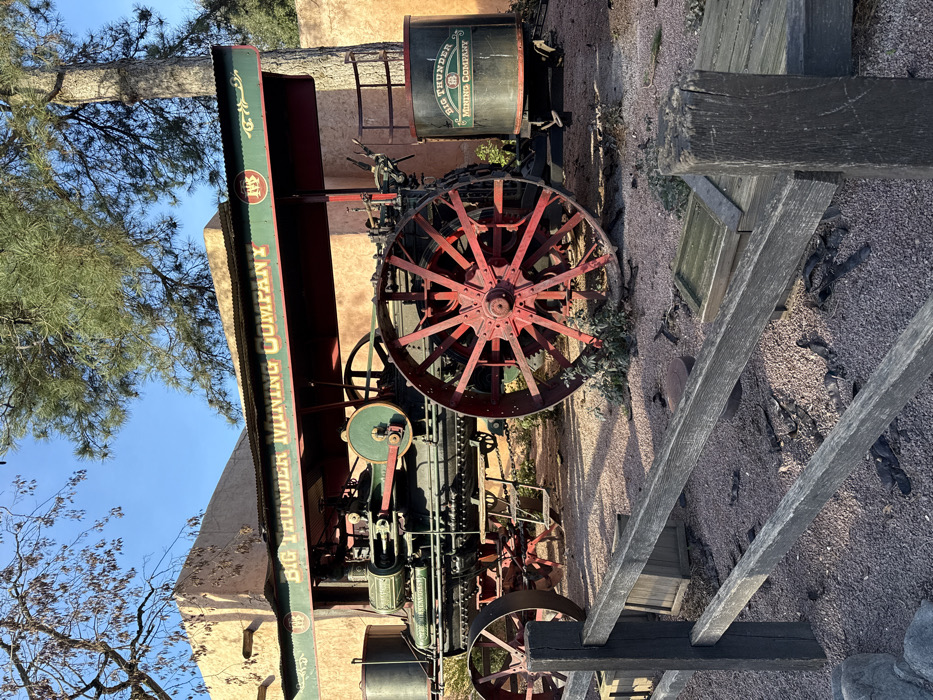 An old steam-powered tractor labeled "Big Thunder Mining Company" is the main focus. The tractor has large red spoke wheels and a green and black engine. It stands in an outdoor setting with gravel and a wooden fence in the foreground. A tree and building are visible in the background under a blue sky. The image has been rotated ninety degrees counter-clockwise.