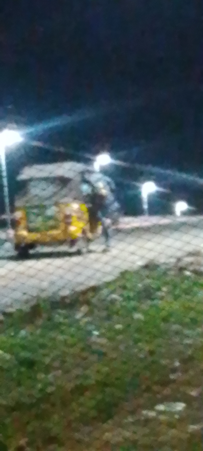 The image depicts a nighttime scene in Zango-ndaji, Nigeria. A yellow and green three-wheeled vehicle, consistent with an auto-rickshaw or Keke NAPEP, is positioned on a paved road surface slightly to the left of the frame's center. One indistinct human figure is partially visible near the rear of the vehicle, and another blurred figure on a bicycle appears alongside it, to the right. Multiple bright, white streetlights illuminate the background, casting light on the scene. A prominent mesh or net-like fence structure, characterized by a diamond grid pattern, occupies the foreground, partially obscuring the lower half of the image. To the right of the paved area and in the immediate foreground, there is a vegetated patch of green grass and foliage. The overall lighting suggests artificial illumination in dark conditions, and the image exhibits significant motion blur and low resolution.