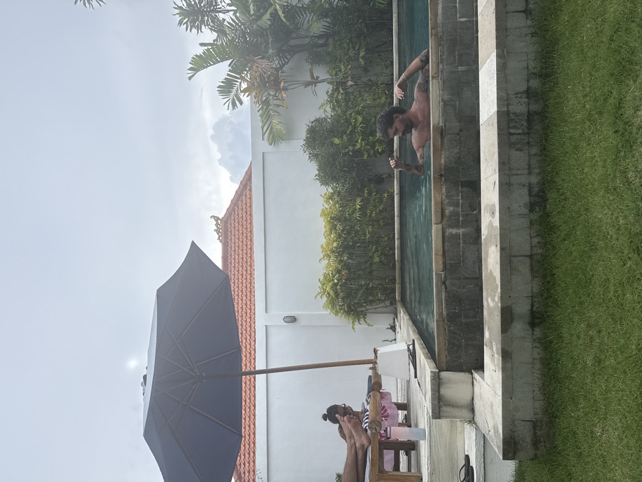 The image depicts an outdoor scene in Pecatu, Indonesia, featuring a private swimming pool area under an overcast, light grey sky. In the foreground, a manicured green lawn occupies the lower portion of the frame. A rectangular swimming pool, constructed with light-colored stone block coping and a tiled interior, is centrally positioned. A male individual is partially submerged in the pool from the chest up, located towards the right. He possesses dark, wavy hair, a beard, and visible tattoos on both arms. His arms are bent with hands slightly raised and open, and he is looking towards his left. To the left of the pool, a light-colored wooden sun lounger with a white mattress pad and a pink and white striped towel is present. An adult's lower legs and feet, crossed at the ankles, are visible resting on this lounger. A hand, holding what appears to be a mobile device, is also visible. A light-colored water bottle stands on the ground adjacent to the lounger. A large, dark blue patio umbrella with a wooden pole is open, providing shade over the sun lounger. A pair of black flip-flops rests on the concrete surface near the lounger. The background features a white concrete wall of approximately mid-height, with a singular oval-shaped outdoor light fixture mounted on it. Above the wall, an orange-tiled roof with a traditional Balinese-style decorative finial is visible. Lush tropical vegetation, including various green bushes, hedges, and tall palm trees, extends behind the wall and to the right.