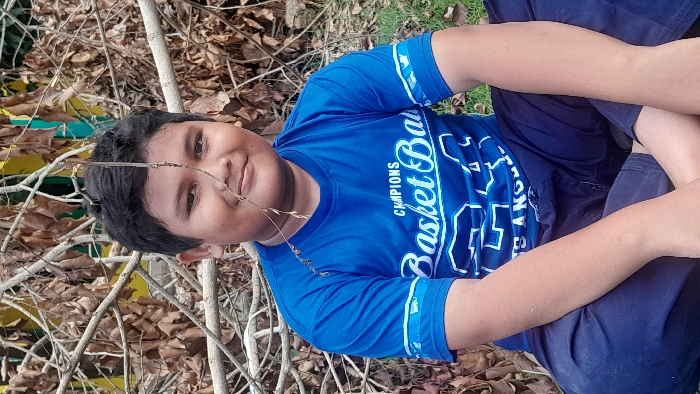 A young boy is seated cross-legged on the ground in an outdoor setting within Lhokseumawe, Indonesia. He is wearing a blue short-sleeved t-shirt displaying "CHAMPIONS Basket Ball" and "S ANGEL" in white text, paired with dark blue long pants. The boy has dark hair, a round face, and is looking towards the viewer with a smile. A thin, dry twig traverses diagonally in front of his face, partially obscuring his right eye and nose. The background consists of a dense arrangement of dry, light brown branches and fallen leaves. Behind this natural debris, a yellow structure is visible on the upper left, and green foliage on the upper right.