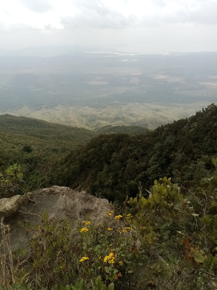 A high-angle view showcases a vast landscape under a cloudy sky. Dense green forests and vegetation cover the foreground, transitioning into a valley. Patches of yellow flowers and shrubs grow near a rocky outcrop at the edge. The distant terrain appears hazy, blending into the sky.
