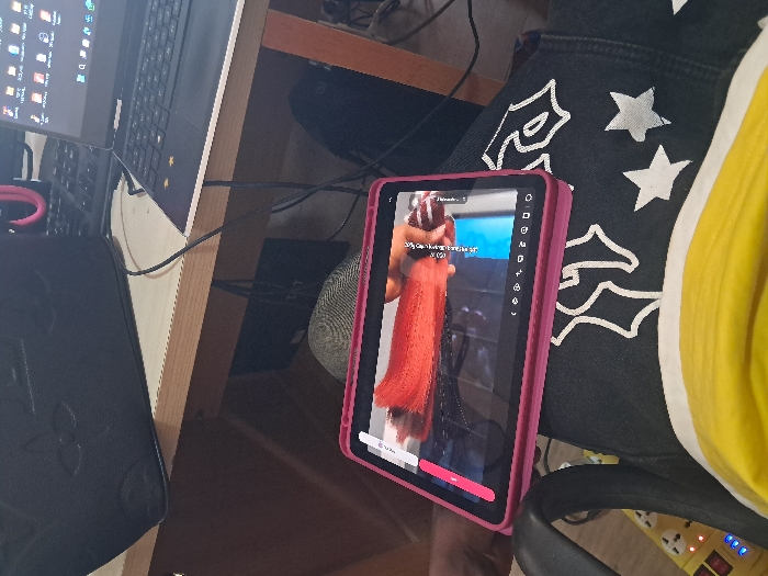 An individual is depicted in an indoor setting, seated, with a tablet computer resting on their lap. The tablet, encased in a magenta cover, displays an image or video of a hand holding a bundle of bright red hair extensions, with what appears to be an editing or media player interface visible on the screen. The individual is wearing a yellow shirt and dark jeans with white stylized symbols and two white stars embroidered or printed on the thigh area. To the left, a portion of a black chair armrest and a yellow and black power strip with blue indicator lights are visible. In the background, a light-colored wooden desk holds a black bag with a repeating monogram-like pattern and an open black laptop computer displaying a desktop interface. A black keyboard and various cables are also visible on and under the desk. The specific location within Ihiagwa, Nigeria, is not discernible from the provided image.