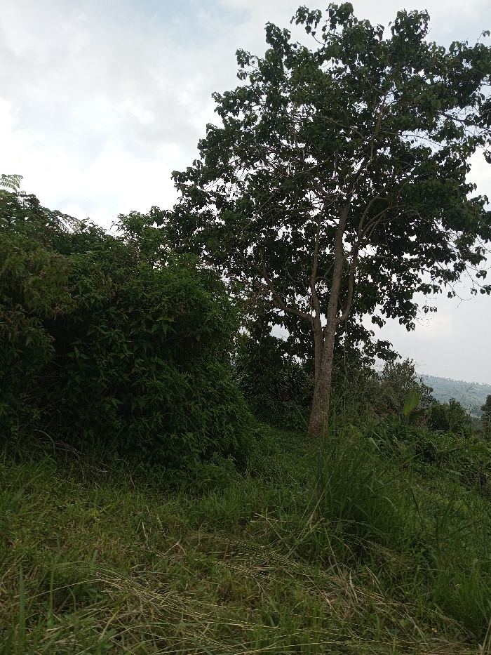 The image displays a natural outdoor scene in the vicinity of Vieng Phouka, Laos, under an overcast, light gray sky. The foreground consists of unkempt green and some dried grasses. To the left, a dense accumulation of green foliage, comprising shrubs and smaller trees, forms a solid wall of vegetation. A prominent, mature tree with a multi-branched, grayish-brown trunk and a full, dark green leafy canopy stands centrally to the right, extending towards the upper edge of the frame. In the distant background on the right, vegetated hills or mountains are discernible through a slight atmospheric haze. No individuals, animals, or man-made structures are visible.
