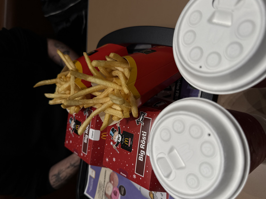- "A close-up, overhead view depicts a fast-food meal served on a black tray atop a brown table, likely within a McDonald's restaurant in Freiburg im Breisgau, Germany" by FM-vVFo03, licensed under CC BY 4.0