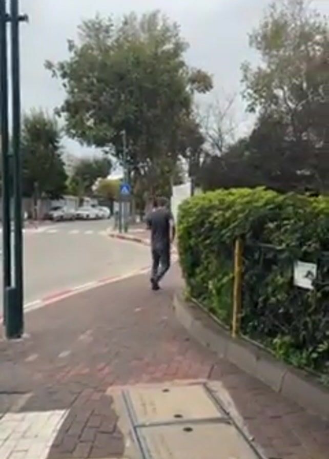 A man walks along a brick sidewalk towards a traffic circle in an urban environment. The sidewalk is composed of small, rectangular bricks arranged in a basketweave pattern. A square metal cover with a ridged surface is embedded in the sidewalk. A utility pole stands to the left. On the right, a dense green hedge lines the sidewalk, partially obscuring a white building with the red number "310" affixed to it. Cars can be seen in the traffic circle in the distance. The sky is overcast. The man is wearing dark clothing. The camera is stationary, panning slightly to follow the man's movement.