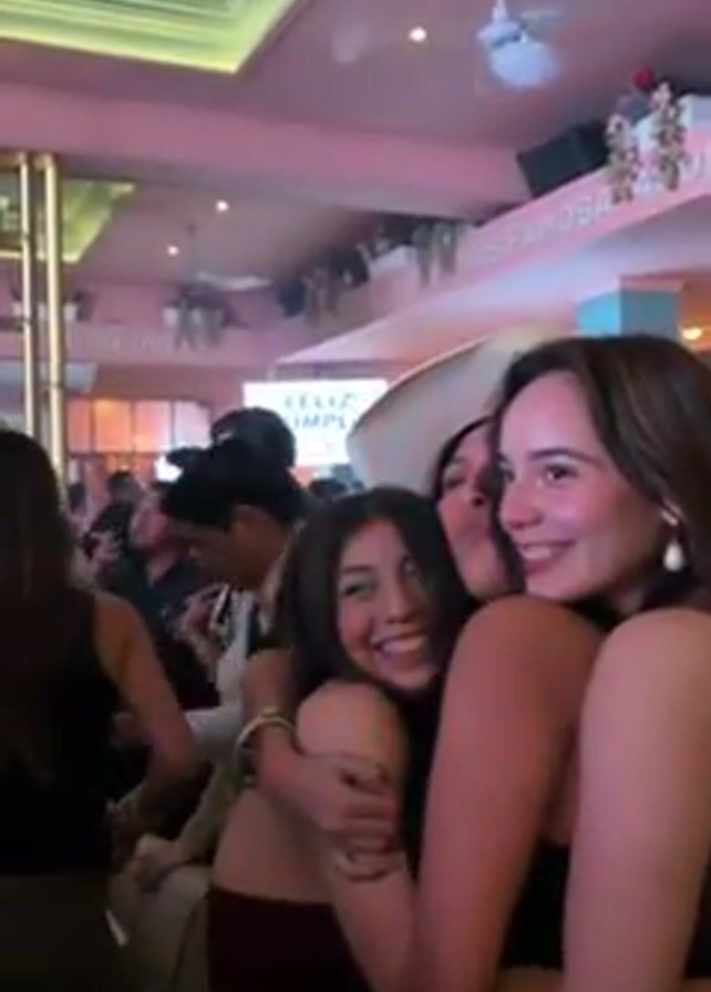 group of at least three young women hugging tightly in a crowded bar or restaurant. They are all smiling and appear to be enjoying themselves, with one woman in the middle wearing a white cowboy hat and holding what looks like a lit sparkler. The background is filled with other people, some standing and others seated at tables. The decor is colorful, with pink walls and ceilings. There's a bar area visible with bottles and glasses behind it. The overall atmosphere appears lively and festive.
