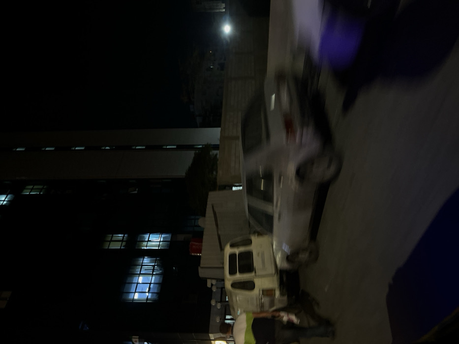 The image depicts an urban night scene in Sarouja Municipality, Syria. In the foreground on the lower right, a highly blurred, dark-colored object, possibly a portion of a vehicle, exhibits a purple hue, indicating motion. On the far left, a male subject is observed from behind, walking away from the camera. He wears a dark long-sleeved shirt with a distinct light-colored horizontal stripe, possibly white or light green, across the upper back and shoulders. Adjacent to the walking subject, a white van, possibly a panel van, is parked or stationary on the left side of the road. To the right of the van, a light-colored (likely white or grey) four-door sedan is captured in motion, traveling rightward across the frame, displaying significant motion blur. In the mid-ground, a low, light-colored concrete wall or structure runs horizontally, with a small, red cylindrical object, possibly a barrel or tank, situated on its surface. Dominating the left background is a tall, dark building with multiple illuminated windows, some emitting a blue light. Further to the right in the background, another narrower, taller building is visible, also featuring illuminated windows. Sparse vegetation is present near the buildings and along the wall. The far right background reveals a bright, distant light source, consistent with a streetlight, against the dark night sky, with indistinct structures visible further in the distance.