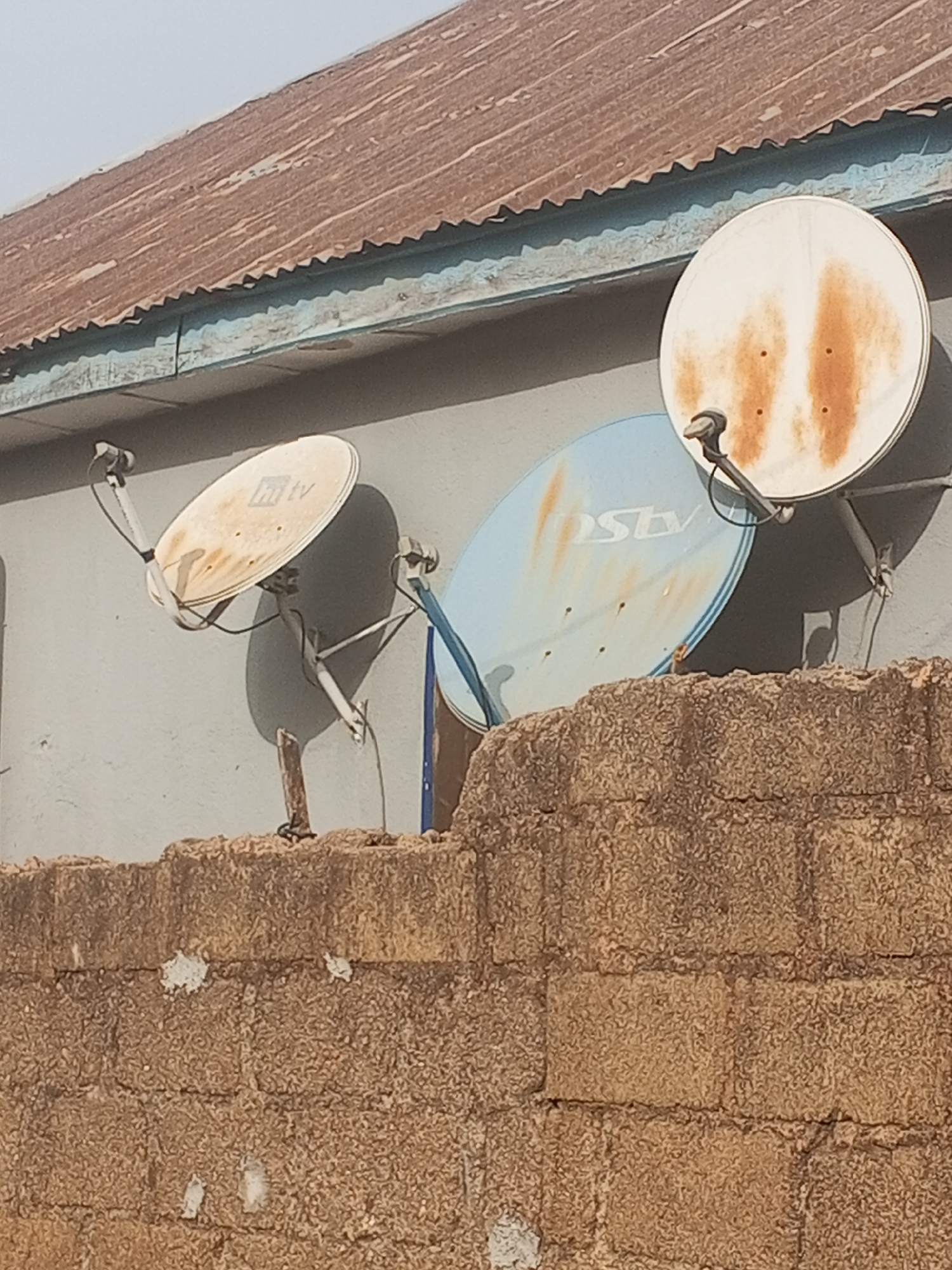 This image, taken in Gura Top, Nigeria, depicts an exterior view of a building. In the foreground, a textured wall constructed from large, rough, brown blocks occupies the lower half of the frame; several white patches are visible on its surface. Directly behind this wall, three satellite dishes are mounted against a light grey painted building wall. The leftmost dish is off-white, branded "Hi TV," and displays discoloration, supported by a white bracket and a vertical wooden post. The central dish is light blue, branded "DStv," and shows significant rust streaks. The rightmost dish is off-white with extensive brown rust and discoloration. All dishes are equipped with LNBs and associated cabling. Above the satellite dishes, a weathered, reddish-brown corrugated metal roof is visible, with a peeling light blue fascia board running along its edge. The scene is illuminated by bright daylight, casting clear shadows. No individuals or discernible actions are present.