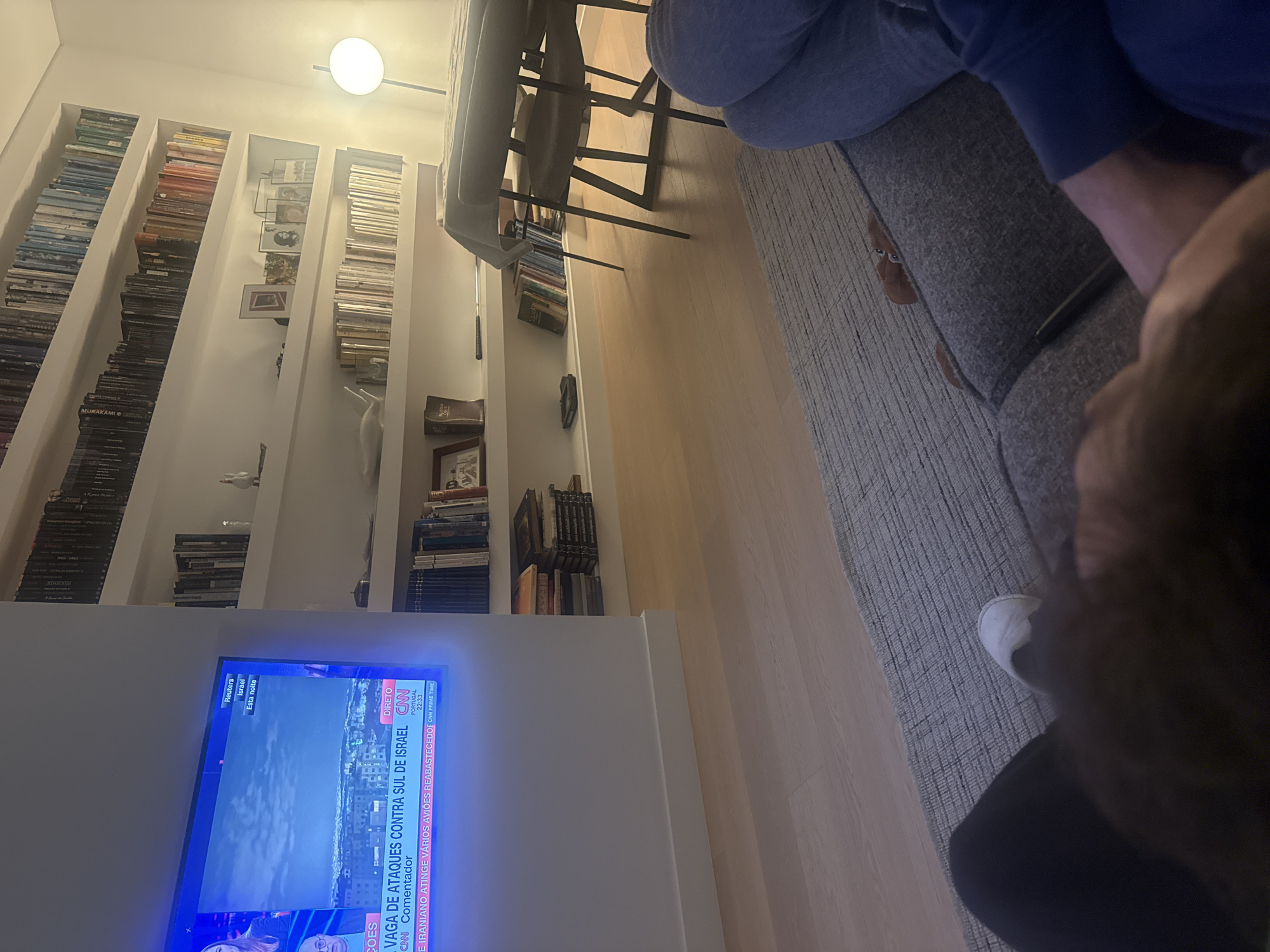 The image depicts an indoor domestic scene in Loures, Portugal, observed from a low angle, focusing on a living area at nighttime. A large flat-screen television is mounted on the left wall, displaying a news broadcast from CNN. The screen shows a panoramic night view of a cityscape, accompanied by Portuguese text: "VAGA DE ATAQUES CONTRA SUL DE ISRAEL" (Wave of attacks against southern Israel), "REUTERS Israel Esta noite" (Reuters Israel Tonight), and "PORTUGAL 22:33". Two news commentators, one female and one male, are partially visible on the screen. To the right of the television, a series of white, floating shelves extend along the wall, densely filled with numerous books of varying sizes and colors. Interspersed among the books are decorative objects, including a white duck figurine, several framed photographs, and what appears to be a religious text titled "BIBLE OG" on a lower shelf. A modern, minimalist floor lamp with a spherical light source is positioned near the right edge of the frame, casting a warm glow. In the immediate foreground, a grey textured area rug covers a light-colored hardwood floor. Two individuals are seated on a grey fabric sofa or armchair. The lower body of one person is visible on the left, wearing dark pants and white slip-on shoes. A dark, furry object or pet is partially visible in their lap. To the right, the lower body and right arm of a second person are visible, wearing blue jeans and a blue long-sleeved top. Their hands are clasped or resting near the first person. A small, brown, anthropomorphic plush toy peeks from behind the sofa cushions. Partially visible behind the seated individuals and to the right is a dining table draped with a dark tablecloth and several dark-legged chairs with grey seats. The overall lighting suggests an evening setting, with artificial light sources providing illumination.