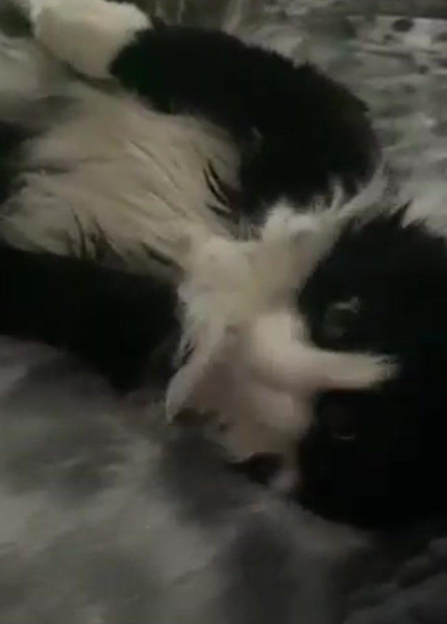 - "A black and white cat lies on its back on a gray textured blanket" by FM-S2rSp2, licensed under CC BY 4.0