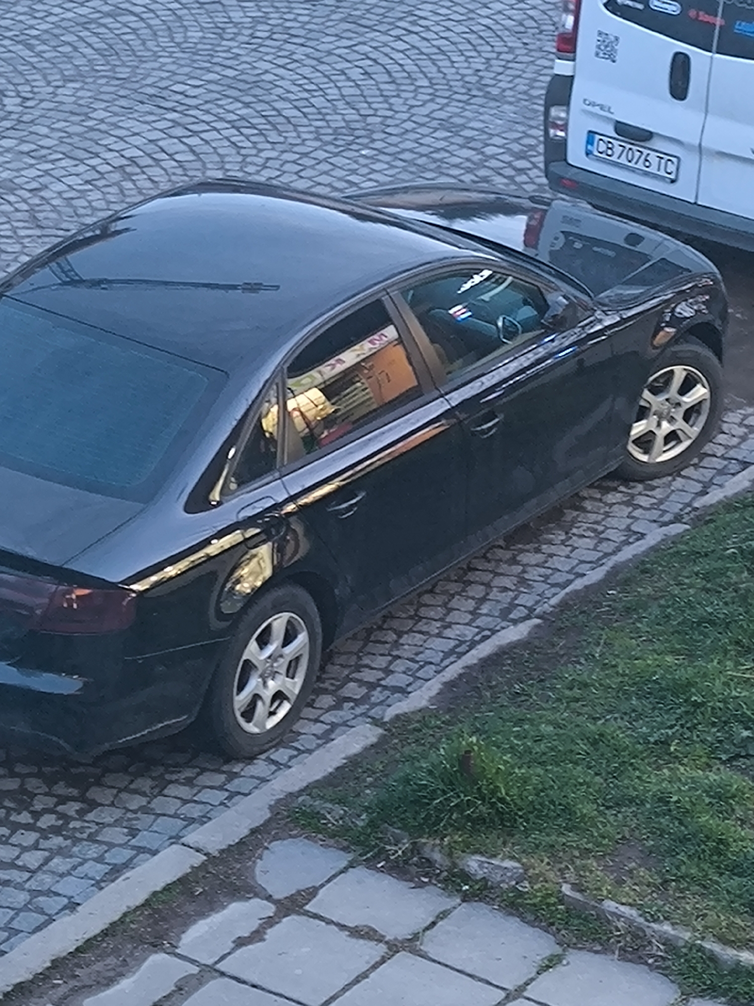 A high-angle shot shows a black four-door sedan parked on a cobblestone street next to a curb and patch of green grass. The car is facing to the right. The license plate on an adjacent white Opel van reads "CB 7076 TC". The image was likely taken in Sofia, Bulgaria, based on the license plate code. The scene appears to be in a residential or commercial area, with building reflections visible in the car windows.
