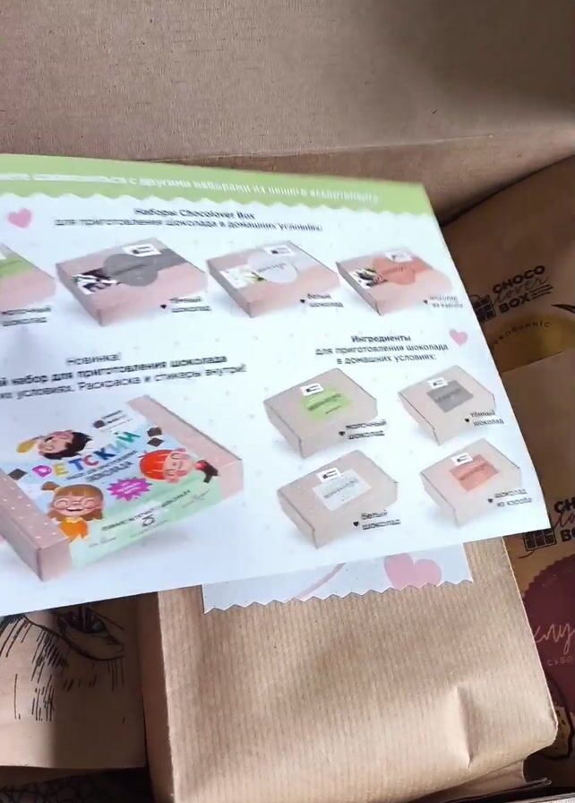 cardboard box filled with brown paper bags. One bag has a label that says "Инструменты для приготовления шоколада" and "CHOCOLOVER_BOX" along with an Instagram logo. A piece of paper visible in the box lists different Choclover Box sets for making chocolate.