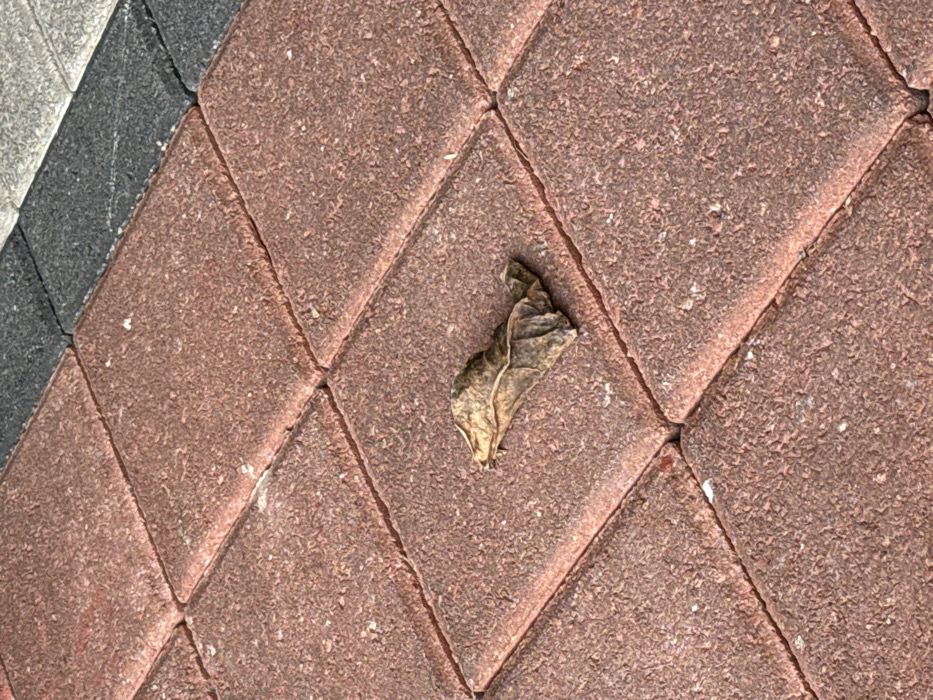 - "A dry, wilted leaf rests on a reddish-brown diamond-patterned brick surface" by FM-rSR2K3, licensed under CC BY 4.0