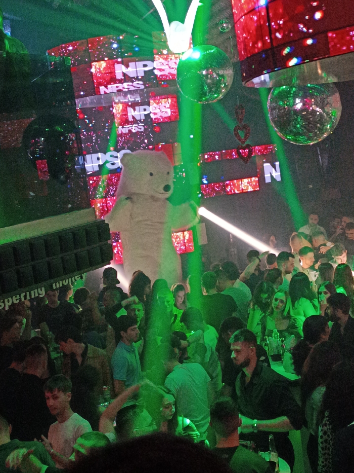 The image captures a crowded, high-energy indoor nightclub scene located in Pamporovo, Bulgaria. The central feature is a large, white, bipedal bear mascot standing prominently on an elevated platform, illuminated by a direct white spotlight beam emanating from the right, with its left arm raised. The club's environment is characterized by intense, dynamic lighting, including multiple green laser beams and spotlights that crisscross the space, particularly highlighting the crowd and the upper areas. Two large, spherical disco balls, glowing green from the ambient lighting, hang from the ceiling. The background is dominated by a large, curved LED screen display showing the white text "NPSS" on a red, sparkling, pixelated pattern. Additional red heart-shaped decorations are suspended in the upper-right area. To the left, a large, multi-component professional audio speaker system is visible, with the word "Whispering" partially discernible on its side, confirming a venue designed for loud music. The main floor is densely packed with a diverse crowd of individuals, predominantly young adults. They are standing, observing, and socializing within the green-lit environment. Several individuals are holding drinks. On the lower right, a bar area is partially visible with bottles and glassware, where several patrons are gathered. The overall scene depicts a vibrant entertainment event within a nightlife establishment.
