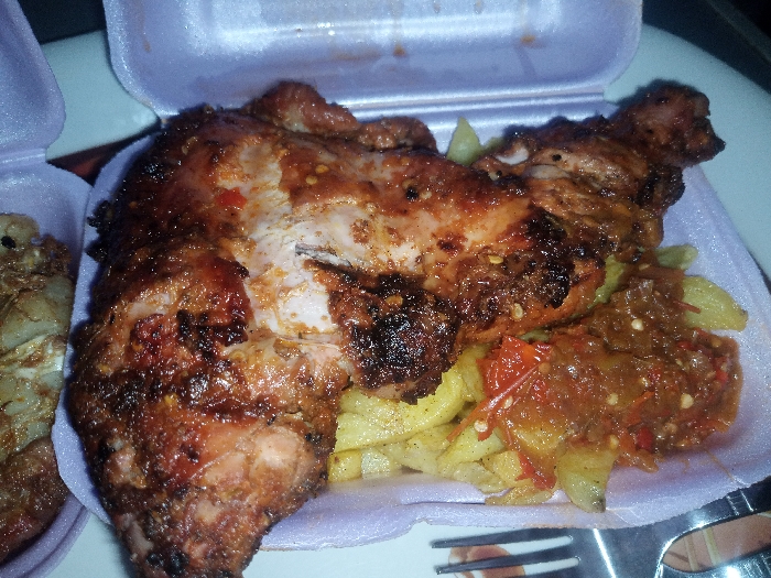 The image displays a meal served in a white styrofoam takeout container with a slight purple hue. The primary subject is a large piece of grilled chicken, dark brown and reddish-brown with visible charring and chili flakes on the skin, positioned towards the center-left. Some lighter-colored meat is exposed where the chicken is sectioned. Beneath the chicken and to its right are light yellow French fries cut into thick strips. A reddish-brown, chunky sauce, containing visible red chili pieces, is dolloped over a portion of the fries and adjacent to the chicken. In the lower right corner, a silver-colored metal fork is partially visible, resting on an indistinct flat surface. To the left, in the background, another open styrofoam container holds additional food items, including some crispy, brown elements. The scene suggests an indoor setting. The location is Unknown, Unknown.