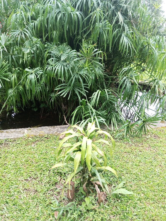 This image depicts an outdoor scene in Pachmarhi, India, characterized by lush vegetation and a body of water. In the foreground, a verdant green lawn covers the ground. Centered slightly to the left in the foreground is a small plant with multiple broad, light green leaves, some of which exhibit yellowing. A dark brown wooden stake is partially visible upright near the base of this plant. A low, horizontal concrete or stone border, light grey in color and partially covered with moss or discoloration, extends across the midground, separating the grassy area from the water. Beyond this border, a dense cluster of tall, thin-stemmed green plants with long, drooping, grass-like leaves dominates the background and upper portion of the frame. These plants appear to be growing near or in a body of water, which is visible as dark, still water on the left side and a brighter, reflective surface on the right, mirroring parts of the overhead foliage. No people or animals are present.