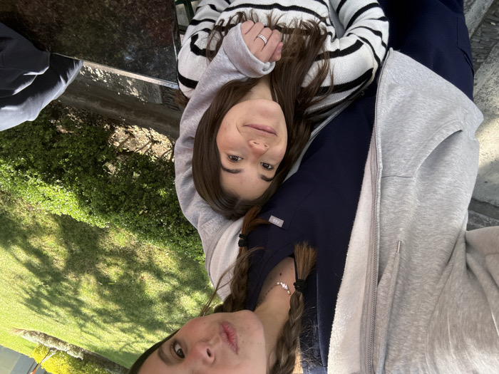 This image depicts two females in an outdoor setting under direct sunlight. The upper individual, partially visible from the nose upward, has brown braided hair and puckered lips, wearing a light grey hooded zipper sweatshirt over a navy v-neck scrub top with a visible "FIGS" label and a "W" pendant necklace. Her right arm is extended around the lower individual's shoulders. The lower individual, fully visible, has long brown hair, a faint smile, and wears a white sweater with black horizontal stripes, with a silver ring visible on her left ring finger. Both subjects are looking towards the camera. The background features a manicured green lawn with tree shadows, bordered by trimmed green hedges. A dark, reflective surface, possibly a polished stone table or bench, is visible in the lower right foreground. The location is in the city of Unknown, Unknown.