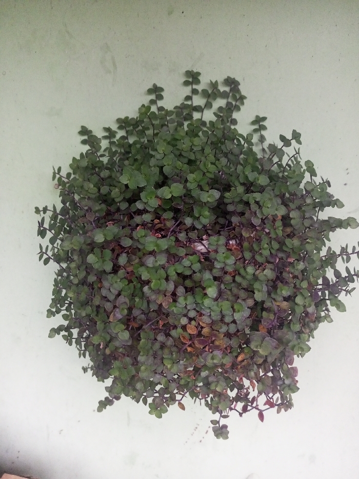 A dense, mounded houseplant, likely *Callisia repens*, is depicted from an overhead perspective. The plant features numerous small, ovate leaves, predominantly dark green on their upper surfaces. Many leaves and thin stems display a reddish-purple hue on their undersides and throughout the lower foliage. Scattered brownish or bronze-colored leaves are visible within the plant's dense mass. A small, white, indistinct object, possibly part of a pot rim or tag, is partially visible near the center of the plant, obscured by foliage. The plant is positioned against a solid, uniformly painted light green wall, which serves as the background. No people, actions, or interactions are present in the scene. The specific location in the city of Bamhori, India, cannot be determined from the visual information provided in the image.
